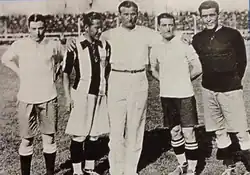 Parados: Serapio Mujica, Francisco de Cicco, Félix Sarasíbar, Octavio Díaz, Florencio Sarasíbar, José Fioroni; hincados: Armando Bertei, Arturo Podestá, José Podestá, Luis Indaco, Esteban Indaco. | ||||