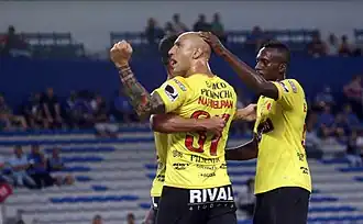 ![]() Ariel Nahuelpán celebrando su gol ante el Delfín S.C. en la Arena Banco del Pacífico por las semifinales de la Copa del Pacífico. | |||||