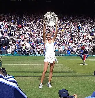 ![]() María levantando el trofeo de Campeona en Wimbledon a los 17 años. | ||