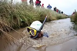 Obstáculo: Un miembro de cada equipo debía practicar buceo de humedales. Después de ponerse un snorkel y ropa de buceo, debía saltar a una piscina lodosa y nadar 91 m en 4 minutos o menos.