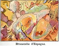 - Brocado de Tortosa (brocatelle de Tortosa), brocado español o de España (brocart espagnol, broccatello di Spagna), denominado marmor schiston por los romanos. Es una roca calcárea organógena, caracterizada por un fondo amarillo dorado con ondas rosa-violáceas y manchas (bioclastos) amarillos, blanco-grisáceos o rosados de forma alargada que le dan el aspecto de brocado. Localmente se le denomina jaspi de Tortosa o jaspi de la Cinta ("jaspe de Tortosa" o "de la Cinta" en catalán)[34] por haber sido empleado en la decoración de la capilla de la Virgen de la Cinta de la catedral de Tortosa.