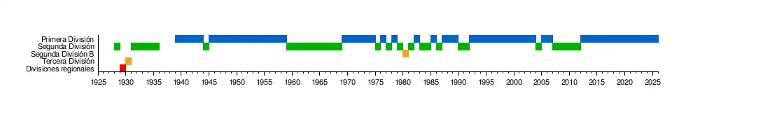 - Las temporadas 1936-37, 1937-38 y 1938-39 no fueron disputadas debido a la Guerra Civil Española. Indicados en verde las temporadas en 2.ª División, en naranja las temporadas en 2.ª B y en rojo, las de 3.ª División.