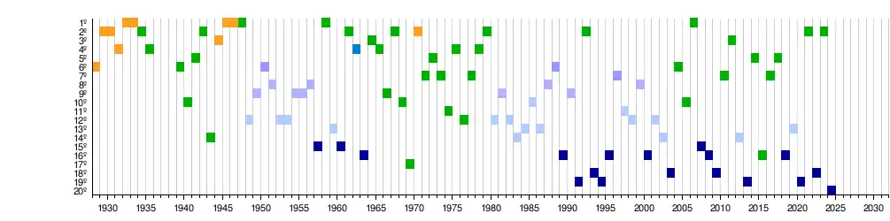 | 1955 | 56 | 57 | 58 | 59 | 60 | 61 | 62 | 63 | 64 | 65 | 66 | 67 | 68 | 69 | 70 | 71 | 72 | 73 | 74 | 75 | 76 | 77 | 78 | 79 | 80 | 81 | 82 | 83 | 84 | 85 | 86 | 87 | 88 | 89 | 90 | 91 | 92 | 93 | 94 | 95 | 96 | 97 | 98 | 99 | 00 | 01 | 02 | 03 | 04 | 05 | 06 | 07 | 08 | 09 | 10 | 11 | 12 | 13 | 14 | 15 | 16 | 17 | 18 | 19 | 20 | 21 | 22 | 23 |