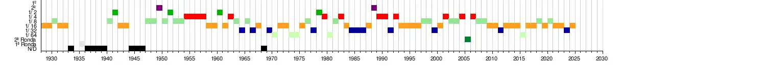 - Las temporadas 1936-37, 1937-38 y 1938-39 no fueron disputadas debido a la guerra civil española. Indicadas las categorías en los siguientes colores: