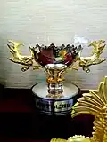Un trofeo de plata elaborado por el artista búlgaro Stavri Kalinov. El trofeo mide 75 centímetros (2 pies y 51⁄2 pulgadas) de alto, y esta decorado con listones de rosas, la flor nacional de Bulgaria. También esta decorado con hojas de oro. | República de Bulgaria | 2012