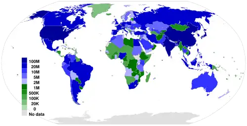 ![]() Número de usuarios de Internet en 2012 Fuente: Unión Internacional de Telecomunicaciones.[3] |