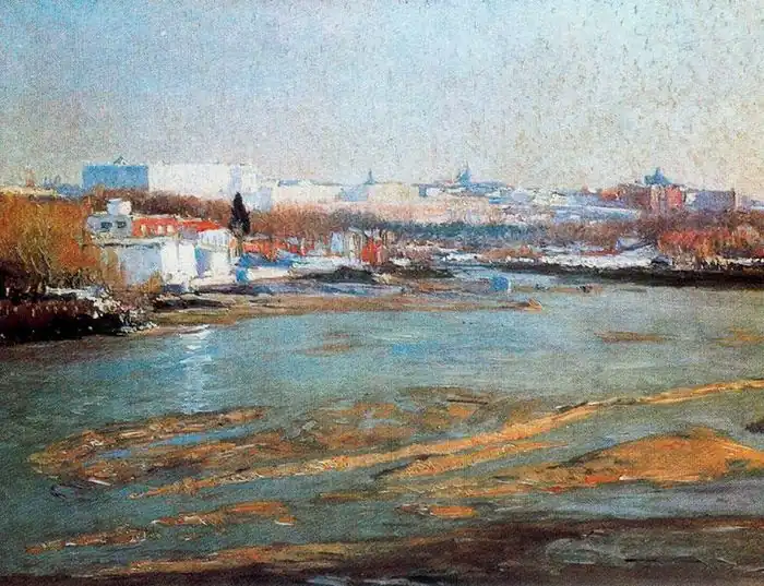 | Madrid desde el Manzanares, en La Florida | ca. 1909 | Aureliano de Beruete | Vista de Madrid desde el río Manzanares, frente a La Florida en el camino del Pardo; se pueden reconocer al fondo las siluetas del Palacio Real, la iglesia de San Andrés y la gran cúpula de San Francisco el Grande. El rojizo colorido de los árboles de la ribera indican que el cuadro fue pintado en otoño. | |