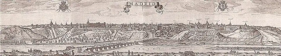 | Profil de la ville de Madrid, capitale du royaume d'Espagne. | 1655-1675 | Israel Silvestre (1621-1691) | Dibujo conservado –en grabado de dos hojas– en la Bibliothèque nationale de France. Contemporáneo del grabado de Julius Milheuser. | |