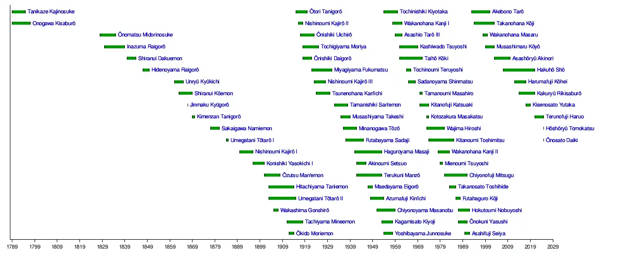 El luchador que ha ostentado el rango de yokozuna por más tiempo es Hakuhō, el cual fue promovido en 2007 retirándose luego en 2021, un total de 14 años.[1]