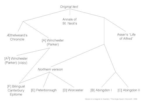 Cada uno de los manuscritos descritos anteriormente comparten un error cronológico entre los años 756 y 845, pero es evidente que el compositor de Anales de St Neots estuvo usando una copia que no tenía este error y que debió haberlos precedido. La copia de Æthelweard tenía el error cronológico, pero no carece de una frase completa de la historia de 885; todos los manuscritos sobrevivientes han perdido esta frase. Por tanto, el error y la oración faltante tuvieron que ser introducidos en fases de copiado separadas, lo que implica que ninguno de los manuscritos sobrevivientes está más cerca que dos transcripciones de la versión original.[24]