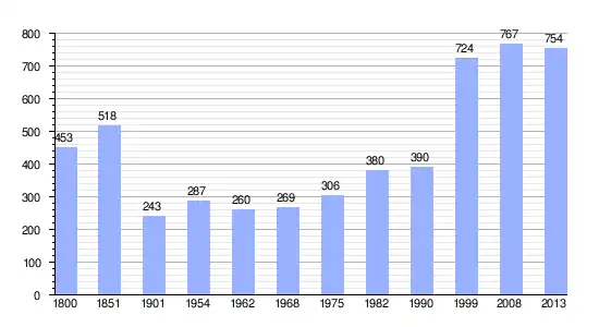 Los datos demográficos contemplados en este gráfico de la comuna de Anguerny[4] se han cogido de 1800 a 1999 de la página francesa EHESS/Cassini, y los demás datos de la página del INSEE.[5]