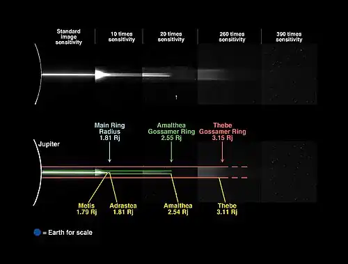 Los anillos de Júpiter son un sistema de anillos planetarios que rodean a dicho planeta. Fue el tercer sistema de anillos descubierto en el sistema solar, después de los sistemas de anillos de Saturno y de Urano. Los anillos de Júpiter fueron observados por primera vez por la sonda espacial Voyager 1,[1] y han sido investigados exhaustivamente durante la década de 1990 y los primeros años del siglo XXI mediante las sondas Galileo, Cassini y New Horizons.[2] También han sido observados desde observatorios terrestres y el telescopio espacial Hubble durante los últimos 25 años.[3] Las observaciones desde la superficie terrestre requieren los más potentes telescopios disponibles.[4]