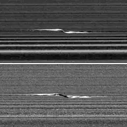 - ↑ Murray, C. D.; Cooper, N. J.; Williams, G. A.; Attree, N. O.; Boyer, J. S. (28 de marzo de 2014). «The discovery and dynamical evolution of an object at the outer edge of Saturn's a ring». Icarus 236: 165-168. Bibcode:2014Icar..236..165M. doi:10.1016/j.icarus.2014.03.024.