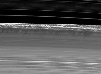 - ↑ Mason, Joe (11 de junio de 2009). «Saturn's Approach To Equinox Reveals Never-before-seen Vertical Structures In Planet's Rings». CICLOPS web site. Archivado desde el original el 15 de junio de 2009. Consultado el 13 de junio de 2009.