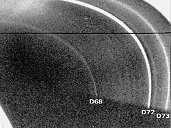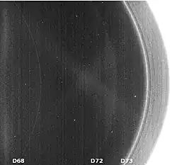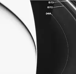 Con la llegada de la misión Cassini-Huygens a Saturno, se observó que estas estructuras habían evolucionado, destacando que la banda D72 se había hecho mucho más tenue.[2] Además, Cassini observó la presencia de perturbaciones ondulatorias de 2 a 20 m de amplitud en el espacio entre D72 y el anillo C moviéndose hacia el exterior del anillo.[3] Durante el equinoccio de 2009, estas ondas llegaron a alcanzar el borde interior del anillo B. Debido a que su longitud de onda decreció desde los 60 km a los 30 km desde 1995 a 2006, se cree que su origen se remonta a 1983, cuando el impacto de una nube de polvo con una masa de aproximadamente mil millones de toneladas proveniente de un cometa perturbase el anillo, desplazando sus fragmentos del plano ecuatorial de Saturno. Un efecto similar en los anillos de Júpiter se atribuye al impacto del cometa Shoemaker-Levy 9 en 1994.[4][5][6]
