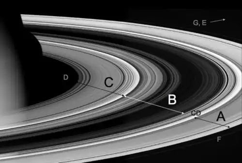 El cuerpo principal del sistema de anillos de Saturno incluye los brillantes anillos A y B, de escasa opacidad. Hay una distancia entre uno y otro de 4800 km: la división de Cassini, región relativamente transparente, aunque no vacía en absoluto. El cuerpo principal del sistema de Saturno comprende también el anillo C, más débil y menos opaco, que queda dentro del borde interior del anillo B. Tiene un grado de opacidad comparable al de la división de Cassini. El todavía más débil anillo D queda dentro del anillo C. Antes de que los Voyager pasaran por la proximidad de Saturno se había reconocido ya la configuración estructural en los anillos del planeta A, B, C y D, observables desde la Tierra, así como las divisiones de Cassini y de Encke. Tomados en su conjunto, los principales anillos de Saturno (A, B y C) miden unos 275 000 km de anchura anular, lo que representa tres cuartas partes de la distancia que separa la Tierra de la Luna. El anillo A está dividido en dos partes por la división de Encke.