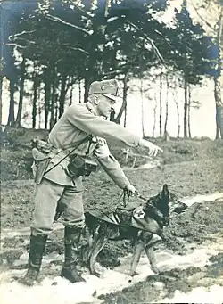 Unos 100.000 perros fueron utilizados por los distintos beligerantes durante el conflicto, especialmente por Alemania y Austria-Hungría que ya usaban los perros en el ejército antes de la contienda y contaba con varias escuelas militares para su entrenamiento.[43] Fueron usados principalmente para transportar objetos o mensajes, remolcar ametralladoras, como perro guardián, para tirar líneas telefónicas entre las trincheras, detectar sonidos u olores o encontrar heridos en el campo de batalla.[2][44] Otra de las funciones principales de los perros en las zonas de guerra fue la de animal de compañía, constituyendo un refugio emocional de los horrores de la guerra, pese a que se intentara evitar por parte del Ejército francés mediante vigilancia y sanciones a los soldados. En diciembre de 1917 se les permitió a los soldados de las trincheras mantener a los perros como animales de compañía hasta que pudieran llevárselos a casa en el siguiente permiso.[45][46] Se ha calculado que murieron alrededor de un 25% de los perros mensajeros y sanitarios que participaron en la guerra.[47]