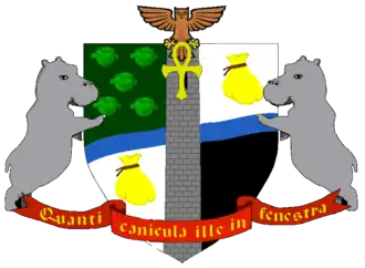 Escudo: Un Escudo, dividido en cuatro por un río (el Ankh) y una torre (la torre del Arte). Dos cuartos tienen una bolsa de dinero, otro un campo de coles y el último un cuadro negro de los Vetinari. El escudo está escoltado por dos hipopótamos y un morpork sosteniendo un ankh entre sus patas. Himno Nacional: We Can Rule You Wholesale | ||