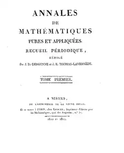 Annales de Mathématiques Pures et Appliquées, comúnmente conocidos como Annales de Gergonne, fue una revista matemática publicada en Nimes, Francia, desde 1810 hasta 1831 por Joseph-Diaz Gergonne. Los anales se dedicaron en gran medida a la geometría, con artículos adicionales sobre historia, filosofía y educación matemática que muestran la interdisciplinariedad de la publicación.[1][2]