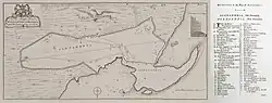 El camino principal tenía 300 metros de largo (1000 pies) y acogía una explanada enfrente del Cesáreo, en el paseo marítimo continental. En la explanada, Goddio descubrió las ruinas de un palacio del siglo III a. C., relativamente modesto (90 por 30 metros) y con suelo de mármol, que podría haber sido la residencia real de Cleopatra.[9] En otro camino estrecho de la isla, había un pequeño templo de Isis con una estatua de granito a tamaño real en su entrada. Dicha figura representaba a un sacerdote egipcio de la diosa Isis con la cabeza afeitada, que portaba un canope de Osiris.[10] Un par de esfinges de granito flanqueaban la estatua, una de las cuales tenía la cabeza de Ptolomeo XII, el padre de Cleopatra. Entre los caminos secundarios del lado oriental de la isla había un pequeño puerto con dársenas. Aquí había una serie de 60 columnas, cada una de 1 metro de diámetro y 7 metros de alto, hechas de granito rojo egipcio y rematadas con una corona decorada. Pinturas antiguas indicarían que las columnas representaban la entrada ceremonial a la isla.[11] En las inmediaciones del puerto se han identificado los pecios de un barco romano de 30 metros de largo que datarían del siglo I a. C. o del siglo I d. C.[12]El agujero en el casco del barco sugeriría que este podría haberse hundido tras haber sido golpeado por otro barco.[2]