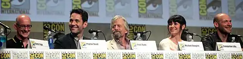 - Evangeline Lilly como Hope Van Dyne: La hija de Hank Pym y Janet Van Dyne y un miembro principal de la junta de Pym Technologies, que ayuda a Darren Cross a apoderarse de la compañía.[16][17][18][19][20] A lo largo de la película, la progresión del personaje la acerca a convertirse en una heroína.[21] Lilly describió a su personaje como "capaz, fuerte, y ruda", pero dijo que ser criada por dos superhéroes resultó en que Hope sea "un humano bastante dañado [...] y el mensaje claro que envía mi nombre es que no me agrada mucho mi padre, así que tomé el nombre de mi madre."[22] Añadió que el "arco [de Van Dyne] en la película es intentar encontrar una relación" con Pym.[13] Originalmente elegida por Wright, Lilly estaba reticente a aceptar el papel luego de que él abandonara el proyecto, hasta que leyó el guion revisado y tuvo la chance de reunirse on Reed.[18] Feige dijo que Van Dyne era la opción más obvia para recibir el manto de Ant-Man, siendo "infinitamente más capaz de ser un superhéroe" que Lang, y que la razón de que eso no suceda es debido a la experiencia de Pym con la pérdida de su esposa, en vez de por sexismo, que según Feige no sería un problema para Pym en la actualidad. Lilly firmó un contrato de múltiples películas con Marvel.[23]