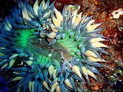 Las anémonas contienen algas simbióticas; mutualistas (ambos organismos se benefician de la relación) llamadas zooxantelas. Las algas realizan la fotosíntesis produciendo oxígeno y azúcares, que son aprovechados por las anémonas, y se alimentan de los catabolitos de la anémona (especialmente fósforo y nitrógeno).[4] No obstante, las anémonas se alimentan tanto de los productos que generan estas algas (entre un 75 y un 90 %), como de las presas de zooplancton o peces, que capturan con sus tentáculos.
