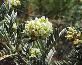 Es un arbusto, no espinoso. Tallos y ramas fuertemente leñosas. Ramas jóvenes poco lignificadas verdosas. Flores de color blanco crema, agrupadas en número superior a 10 en capítulos terminales. Hojas imparipinnadas, con raquis villoso sedoso, con pelos blancos muy cortos. Cáliz de 4-6 mm, tubular, poco inflado, cubierto de pelos brillantes. Corola amariposada muy pequeña. El fruto es una pequeña legumbre recta con una sola semilla en su interior. Florece en primavera, verano y fructifica en verano.