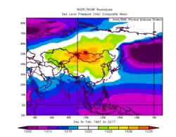 El anticiclón de Siberia es una masa de aire seco frío o muy frío que se acumula en el territorio de Siberia durante gran parte del año y está relacionado con el clima hipercontinental. Alcanza su mayor tamaño y alcance en el invierno, cuando las temperaturas del aire cerca del centro de la célula de alta presión o anticiclón es a menudo inferior a -40 °C. La presión a nivel del mar (presión atmosférica) está a menudo por encima de los 1.040 milibares. El anticiclón de Siberia es el anticiclón semipermanente más fuerte del hemisferio norte y es responsable tanto de la temperatura más baja en el hemisferio norte, de -67,7 °C en Verjoyansk el 5 y 7 de febrero de 1892 y en Oimiakón el 6 de febrero de 1933[1] y la presión más alta, 1.083,8 milibares (108,38 kPa) en Ágata, en el Krai de Krasnoyarsk, el 31 de diciembre de 1968.[2]