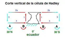 En la región de las latitudes subtropicales, entre 31 y 34 grados de latitud sur y norte, se encuentra debajo del ecuador, donde la fuerza de Coriolis es bastante escasa, se establece una circulación directa del aire. En los bajos niveles de la atmósfera, la diferencia de temperatura entre el ecuador y las regiones más al norte o al sur, menos calientes, da lugar a la zona de convergencia intertropical donde el aire más caliente se eleva debido a la convergencia y al principio de Arquímedes. En consecuencia, este aire se enfría al ganar altura y vuelve a bajar más al norte y al sur.[1]