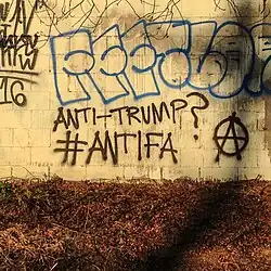 Junto con los activistas del bloque negro, los grupos antifa estuvieron entre los que protestaron por la elección de Donald Trump en 2016.[37] Los activistas de Antifa también participaron en las Protestas de Berkeley de 2017 contra el polémico escritor de extrema derecha Milo Yiannopoulos, durante la cual lanzaron cócteles Molotov y rompieron ventanas, causando daños por valor de 100.000 dólares.[38] Después del incidente, el alcalde de Berkeley Jesse Arreguin, sugirió clasificar a los antifa de la ciudad como una pandilla.[39]