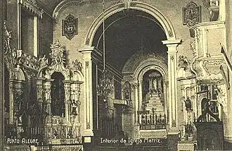 El interior estaba dividido en una nave y un presbiterio, con cinco altares principales en total, todos ricamente dorados en un estilo que revela una mezcla de influencias barrocas y rococó, similares a los que aún se conservan en la Matriz de Viamão, con estatuas y ornamentos preciosos como antorchas y candelabros. Había pinturas en las paredes y el techo del presbiterio también estaba pintado decorativamente con una copia de una composición de Rafael Sanzio que representaba a la Virgen María.[2]