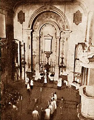 La antigua iglesia parroquial era típica del período barroco tardío con una fachada austera y un interior ricamente decorado. La fachada estaba dividida en tres bloques principales: el cuerpo y dos torres adosadas. La iglesia tenía tres puertas a nivel de calle, siendo la central la más alta, cerrada por paneles tallados, y tres ventanas alineadas encima, en el nivel superior, con dinteles tallados. El bloque estaba coronado por un frontón delicadamente curvado con un óculo circular. A ambos lados del frontón había dos pequeños pináculos rematados por una esfera. Las dos torres tenían tres niveles, sostenidos por prominentes pilastras, y estaban coronadas por ménsulas prismáticas rodeadas de pináculos, con una cruz en la parte superior.[2]