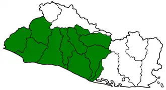 En verde, el Señorío de Cuscatlán, cuya capital fue el actual municipio de Antiguo Cuscatlán.