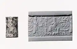 - Un estilo "OA 2" (Antiguo Asirio-capacodio). Se han localizado cilindros de sellos de este estilo. Son sellos más pequeños que el estilo anterior con representaciones más estilizadas y angulares. El tema también suele incluir escenas de presentación real, pero acompañadas de una segunda escena secundaria de animales, humanos o deidades. Los nuevos temas primarios que aparecen en este estilo son escenas de culto en las que las figuras se sitúan ante una deidad, símbolos divinos o escenas de vehículos con ruedas. La influencia anatolia es más fuerte aquí que en el otro estilo con la inclusión de pájaros o hileras de animales. Algunos de estos sellos son muy similares, lo que parece indicar una producción "en masa". Rara vez están inscritos y cuando es posible identificar a sus propietarios se trata habitualmente de asirios pero también hay de procedencia anatolia.[26]