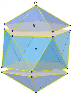 Si todas sus caras son regulares (dos pentágonos regulares y diez triángulosequiláteros), es un poliedro semirregular. También puede ser considerado como un icosaedro parabidisminuido, una figura formada por la eliminación de dos pirámidespentagonaless de un icosaedro regular dejando dos caras pentagonales adyacentes; una figura relacionada, el icosaedro metabidisminuido (uno de los sólidos de Johnson), se forma también a partir de un icosaedro mediante la eliminación de dos pirámides, pero sus caras pentagonales son adyacentes entre sí. Las dos caras pentagonales de cualquier forma se pueden aumentar con pirámides para formar el icosaedro.