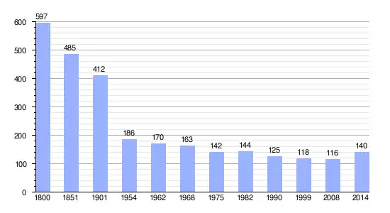 Los datos demográficos contemplados en este gráfico de la comuna de Antoigny[4] se han cogido de 1800 a 1999 de la página francesa EHESS/Cassini, y los demás datos de la página del INSEE.[5]