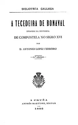 - A tecedeira de Bonaval (La tejedora de Bonaval, 1894), en la que mezcla una historia de amor con los acontecimientos sociopolíticos de la Galicia del siglo XVI: el enfrentamiento entre la burguesía y la Iglesia compostelana.