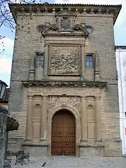 - Por otro lado, a comienzos del siglo xvii también aportó la importante suma de 40 000 ducados para la construcción del recién comenzado seminario de la Compañía de Jesús bajo la advocación de San Ignacio, consiguiendo la Compañía unas instalaciones reputadas como de las mejores de Andalucía.[3] El obispo, una vez fallecido, fue trasladado a Baeza y sepultado en la capilla del centro, única edificación aún conservada una vez demolido el convento a resultas de la desamortización. La figura del obispo Raya queda patente en el templo a través de la reiteración de su escudo prelaticio y de su representación en el relieve monumental de la fachada, en cuyo ángulo inferior derecho aparece de pie y expectante, sosteniendo un báculo en la mano derecha y un sombrero en la izquierda, mientras presencia el éxtasis de San Ignacio que, de rodillas, es arrobado por una visión de la Trinidad.