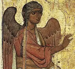 El arcángel está representado con ropa ocre en la parte superior y azulada en la parte inferior de la cintura. La cabeza está peinada con pelo dorado. Los colores complementarios acentúan un drapeado con profundos surcos oscuros. La cabeza y las alas juntas forman una imagen cercana a un tridente. Desde la túnica y el cabello del arcángel cubierto con toques de pan de oro, la luz divina parece extenderse, iluminando el fondo del icono —arriba y a la izquierda del icono—.[30]