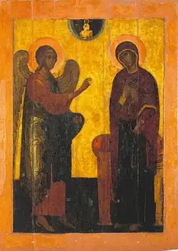 - para la Catedral del Arcángel Miguel de Moscú en el Kremlin de Moscú en el siglo XVI. Esta copia nos permite ver la forma original del icono. Los nimbos y los campos están representados en color rosa, lo que permite suponer que el original de la Anunciación de Ústiug era también de este color,[3] que se confirma por el hecho de que los colores de los nimbos eran característicos de la época para los iconos de Novgorod como en el San Jorge de 1130 de esta misma ciudad;