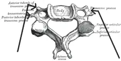 Vértebra cervical. Apófisis transversa señalada y etiquetada arriba a la derecha. | ||