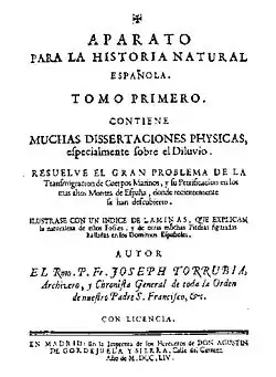 - ↑ a b c Sequeiros, L. (1997). «Tercer centenario del nacimiento de José Torrubia (1698-1761): viajero, naturalista y paleontólogo». Revista Española de Paleontología 13 (2): 287-290. ISSN 0213-6937.