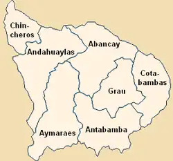 Apurímac, no obstante su singularidad territorial y cultural, recién fue reconocido como departamento por ley del 28 de mayo de 1873, durante el gobierno constitucional de Manuel Pardo. Dos años antes, por ley del 28 de enero de 1871, se dispuso la división de Aymaraes para formar la provincia de Antabamba. De este modo, se creó el departamento en 1873 por las provincias de Andahuaylas (Ayacucho) y de Abancay, Cotabambas, Antabamba y Aymaraes (las cuatro del Cusco) La provincia de Grau se creó en virtud de la Ley N.º 40008 del 4 de noviembre de 1919, cambiando de nombre a la provincia de Cotabambas, en homenaje al diputado Rafael Grau Cavero, hijo del héroe de Angamos, representante al Congreso por Cotabambas que fuera asesinado en Palcaro el 4 de enero de 1917. Años después, la ley 13407 del 10 de marzo de 1960, dispuso la división del territorio perteneciente a la provincia de Grau, formando nuevamente la provincia de Cotabambas con los distritos situados hacia el oriente. Por su parte, la creación de la provincia de Chincheros se debe a la Ley N.º 23759 del 30 de diciembre de 1983.