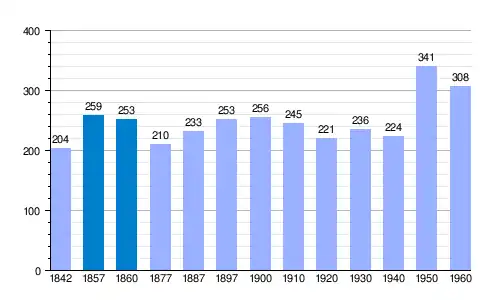 | Gráfica de evolución demográfica de Aquilué[3] entre 1842 y 1960 |