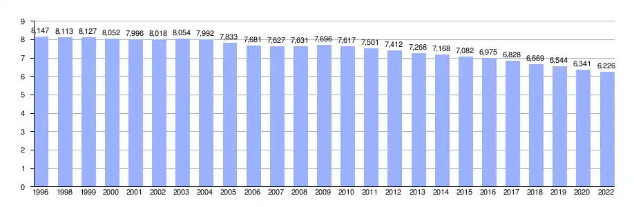 | Gráfica de evolución demográfica de Aranda entre 1996 y 2022 |