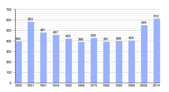 Los datos demográficos contemplados en este gráfico de la comuna de Arandon[4] se han cogido de 1800 a 1999 de la página francesa EHESS/Cassini, y los demás datos de la página del INSEE.[5]