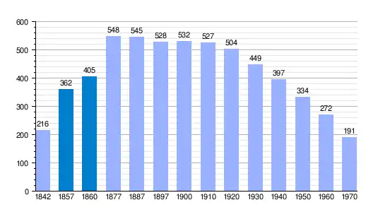 | Gráfica de evolución demográfica de Arbaniés[2] entre 1842 y 1970 |