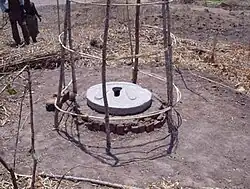 [3] En sectores con suelos muy arenosos, es conveniente colocar una viga circular de concreto o ferrocemento sobre el suelo y, luego, excavar en el espacio en su interior, para reforzar el borde del hoyo y evitar aún más su posible colapso.