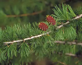 ![]() Rama de Larix occidentalis con unos conos inmaduros. | ||