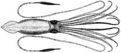 Calamar gigante, Architeuthis, modificado a partir de una ilustración de A.E. Verrill, 1880 | ||